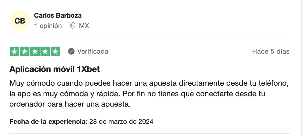 La 1xBet app cuenta con cientos de opiniones de jugadores de todo el país. Por ejemplo, algunos jugadores la consideran una de las mejores aplicaciones de apuestas. Aunque también es importante destacar que, a pesar de algunos inconvenientes como problemas para jugar a las tragamonedas desde la app, muchos usuarios disfrutan de una experiencia satisfactoria en otras áreas de la aplicación.