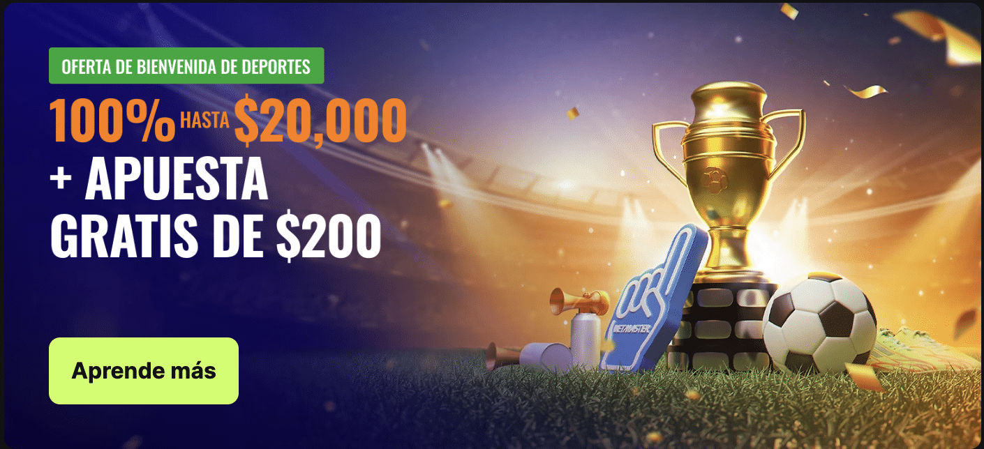 Al registrarte usando el código promocional Betmaster México podrás disfrutar del Betmaster bono de bienvenida para deportes. Obtén el 100% de tu primer depósito de mínimo 300 MXN y gana hasta 20,000 MXN más una apuesta gratis de 200 MXN.